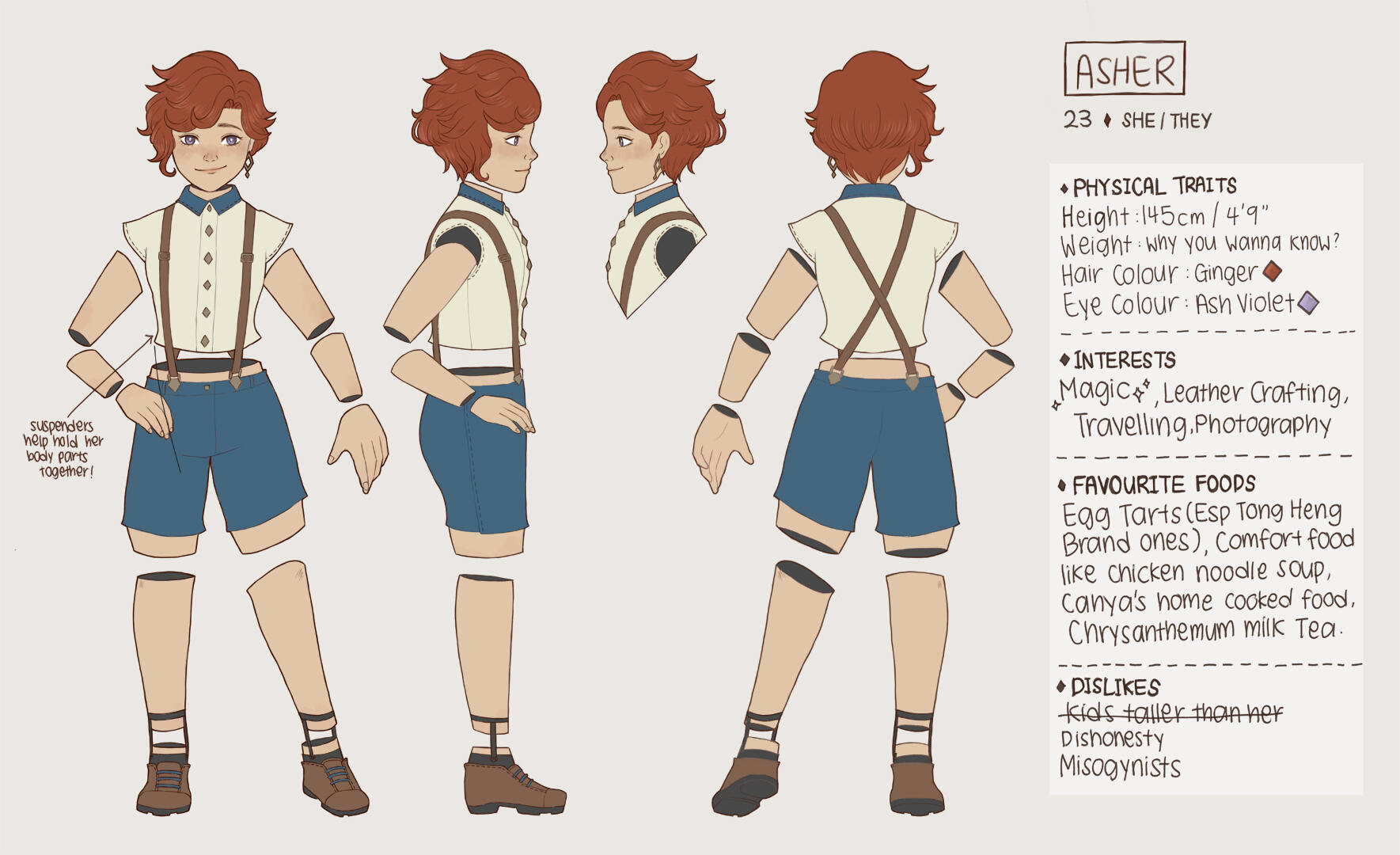 An animated doll of mysterious origins: Asher was brought up by her adoptive parents, who took her in when Asher was accidentally shipped to them with magic supplies.She travels frequently to different towns as a magic assistant and would love to have her very own magic show one day.